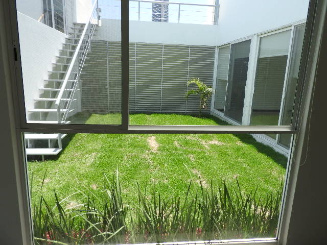 Planta baja: sala con vista a jardín, comedor con vista a jardín, family room/ sala deTV, estudio/ cuarto de servicio con baño completo, cocina integral con placa de granito, cuarto de lavado, medio baño de visitas, jardín interior principal de 35 m2., jardín trasero de 20 m2., cochera semi cubierta para dos autos con bodega.