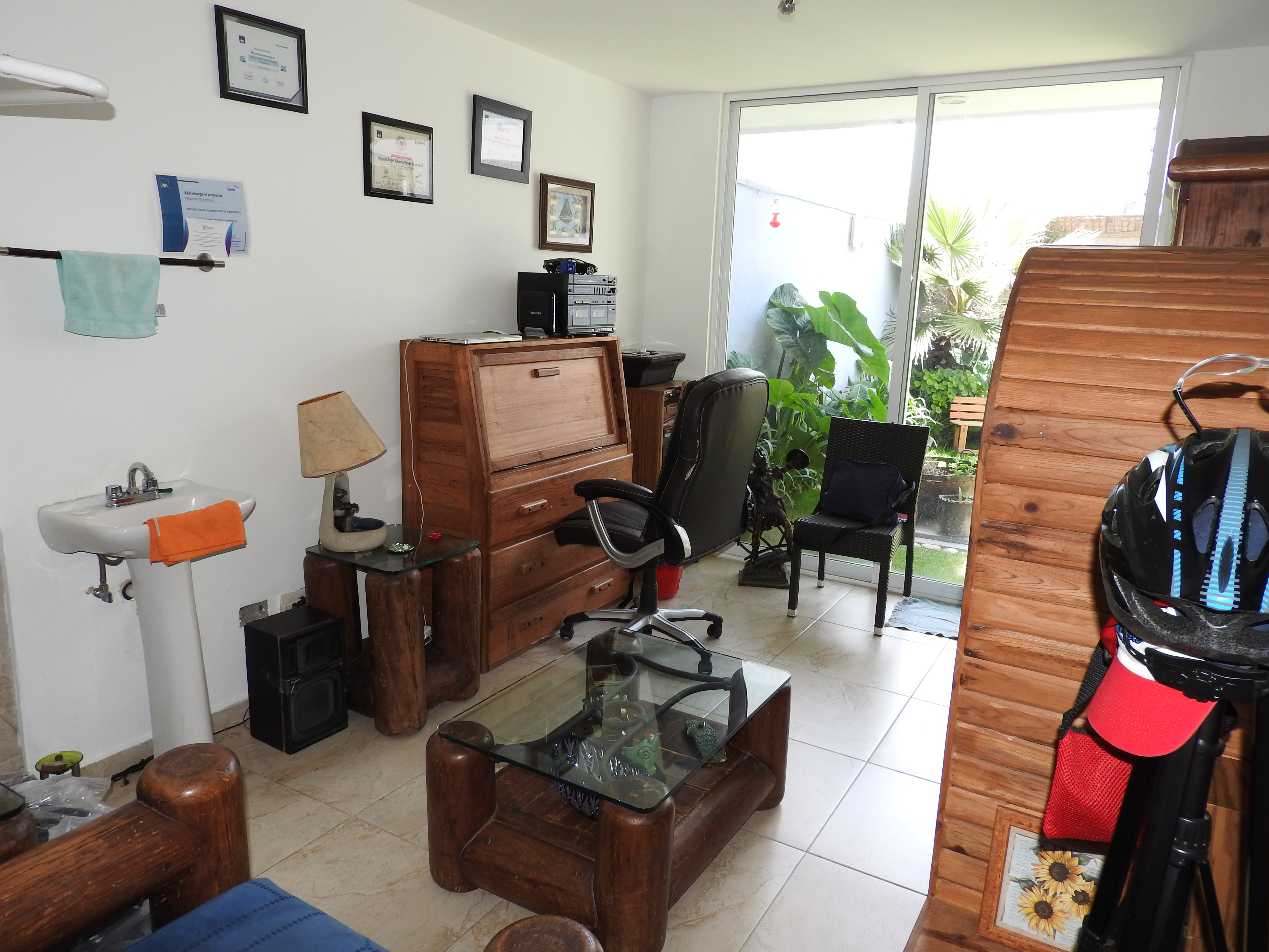 Planta baja: Sala, comedor, cocina integral equipada con barra desayunador, recámara con baño y vista al jardín, jardín, estacionamiento descubierto de hasta 2 autos con portón manual.